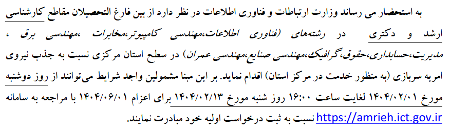 چهارمین مرحله جذب نیروی امریه سربازی در وزارت ارتباطات و فناوری اطلاعات ۲۷ فروردین ۱۴۰۴ | ۱۵:۱۱ کد : ۵۰۸۰۸ اطلاعیه ارسال به دیگران نام شما ایمیل شما ایمیل دریافتکننده ارسال انصراف تعداد بازدید:۳۸۱۱ فراخوان چهارمین مرحله جذب نیروی امریه سربازی در وزارت ارتباطات و فناوری اطلاعات