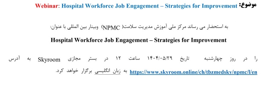 وبینار آموزشی بین المللی Hospital Workforce Job Engagement – Strategies for Improvement ۲۹ مرداد ۱۴۰۴ | ۱۰:۰۱ کد : ۵۳۹۲۵ اطلاعیه ارسال به دیگران نام شما ایمیل شما ایمیل دریافتکننده ارسال انصراف تعداد بازدید:۱۳۴۵ وبینار آموزشی بین المللی Hospital Workforce Job Engagement – Strategies for Improvement