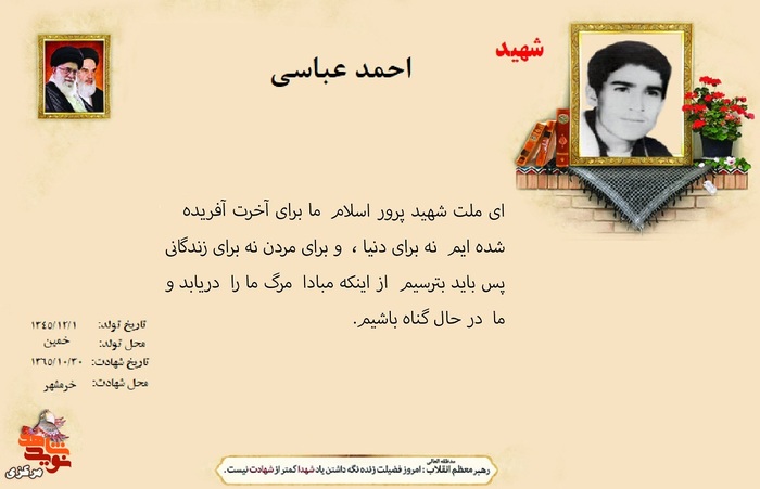 فرازی از وصیت نامه شهدا ۱۳ دی ۱۴۰۴ | ۱۰:۰۱ کد : ۵۷۴۶۹ اطلاعیه ارسال به دیگران نام شما ایمیل شما ایمیل دریافتکننده ارسال انصراف تعداد بازدید:۴۵۰ فرازی از وصیت نامه شهدا فرازی از وصیت نامه شهید بزرگوار احمد عباسی :