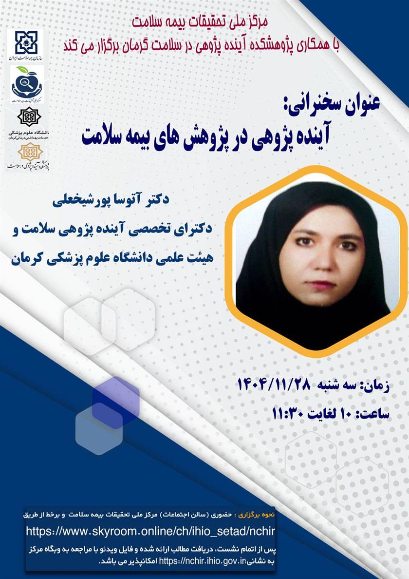 نشست علمی - تخصصی آینده پژوهی در پژوهش های بیمه سلامت ۲۶ بهمن ۱۴۰۴ | ۱۲:۱۹ کد : ۵۸۰۱۲ اطلاعیه ارسال به دیگران نام شما ایمیل شما ایمیل دریافتکننده ارسال انصراف تعداد بازدید:۷۳۹ نشست علمی - تخصصی آینده پژوهی در پژوهش های بیمه سلامت